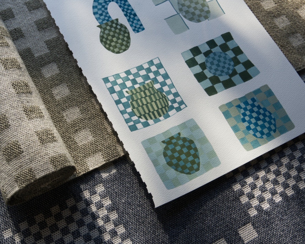 By juxtaposing hand woven textiles and ceramic forms, each artist explores the visual language of checks, squares, and lines and how they converse, distort, and change between mediums. Presented together, these intersections create a visual contrast between hard and soft, hand drawn and precise, 3d and flat, square and curve. Through orderly and organic lines and shapes, this installation creates moments of harmony and disharmony, and gives us an excuse to use our favourite effect: checks on checks on checks!